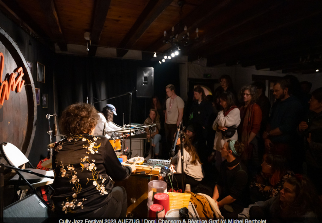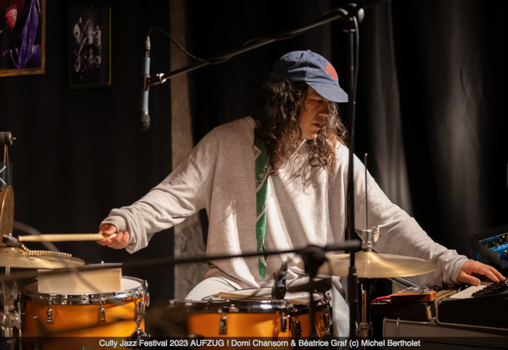 Créé à l’occasion d’un live streaming du Moods Jazz club de Zürich pendant Covid 19 la paire-rencontre entre la super multiactive genevoise Béatrice Graf et le hautement établi musicien et producteur zürichois Domi Chansorn se produit sous le nom d’Aufzug ! Fous de la composition instantanée et de groove, les deux batteur.e.s improvisent avec de vieux synthés moog, des guitares une corde, une batterie d’objets ou des jouets d’enfants. … les combinant en des pièces sonores aussi joueuses/ludiques qu’imprévisibles et aux développements subtilement agencés. Langage à la palette musicale merveilleusement variée, à la teneur émotionnelle hautement évocatrice, parfaite invitation à un voyage sensoriel dépaysant. Aufzug ! délivre une musique profondément habitée et au sens le plus juste et puissant du terme, Une palette et liberté sonore totales mêlant rythmes de batterie à des textures guitaristico synthétiques qui créent un voyage groovesque et hypnotique et/ou pouvant aller dans toutes les directions possibles à n’importe quel moment. Un projet/groupe/duo captivant et passionnant